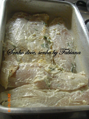 Aqui, coloquei sobre os filés de Saint Peter, temperado com alho, sal, pimenta, limão, salsinha e majericão.